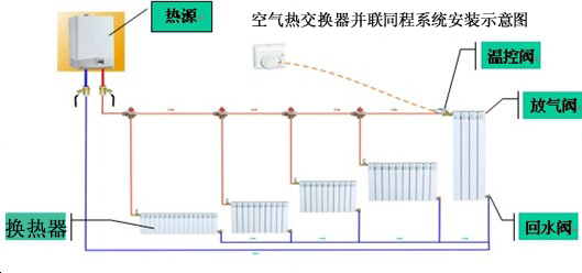 空气热交换器安装有三大典型方式:1、并联方式安装; 2、并联的同程系统;3、分集水器式安装。
