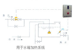 用于水箱加热系统时:CLW智能水温自动控制器的传感器装在水箱中,用于探测水温的温度,电动阀门装设在蒸汽管道上,控制蒸汽管道的蒸汽流量,根据传感器发出的信号来调节蒸汽的流量。