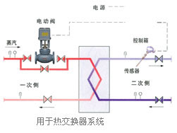 用于水箱加热系统时:HN智能水温自动控制器的传感器装在水箱中,用于探测水温的温度,电动阀门装设在蒸汽管道上,控制蒸汽管道的蒸汽流量,根据传感器发出的信号来调节蒸汽的流量。