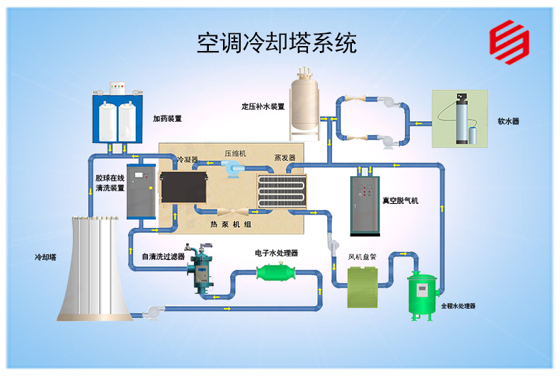 空调冷却塔是将中央空调产生的大量热水,通过冷却塔将热水分散,通过空气流动直接热传递和液体水转化为气态吸收大量热量,而被大气带走,使得水温得以降低,水被回收循环使用的装置。